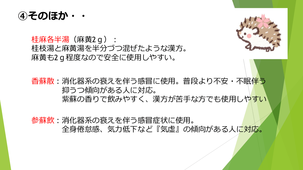#12. ④そのほか・・ 桂麻各半湯(麻黄2g): 桂枝湯と麻黄湯を半分づつ混ぜたような漢方。 麻黄も2g程度なので安全に使用しやすい。 香蘇散:消化器系の衰えを伴う感冒に使用。普段より不安・不眠伴う 抑うつ傾向がある人に対応。 紫蘇の香りで飲みやすく、漢方が苦手な方でも使用しやすい 参蘇飲:消化器系の衰えを伴う感冒症状に使用。 全身倦怠感、気力低下など『気虚』の傾向がある人に対応。