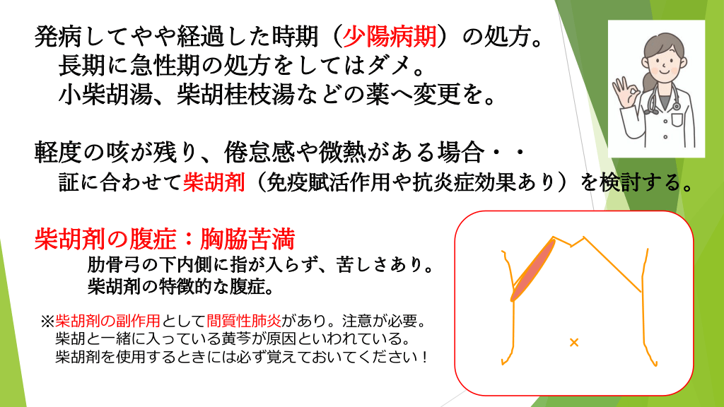 #13. 発病してやや経過した時期(少陽病期)の処方。 長期に急性期の処方をしてはダメ。 小柴胡湯、柴胡桂枝湯などの薬へ変更を。 軽度の咳が残り、倦怠感や微熱がある場合・・ 証に合わせて柴胡剤(免疫賦活作用や抗炎症効果あり)を検討する。 柴胡剤の腹症:胸脇苦満 肋骨弓の下内側に指が入らず、苦しさあり。 柴胡剤の特徴的な腹症。 ※柴胡剤の副作用として間質性肺炎があり。注意が必要。 柴胡と一緒に入っている黄芩が原因といわれている。 柴胡剤を使用するときには必ず覚えておいてください!
