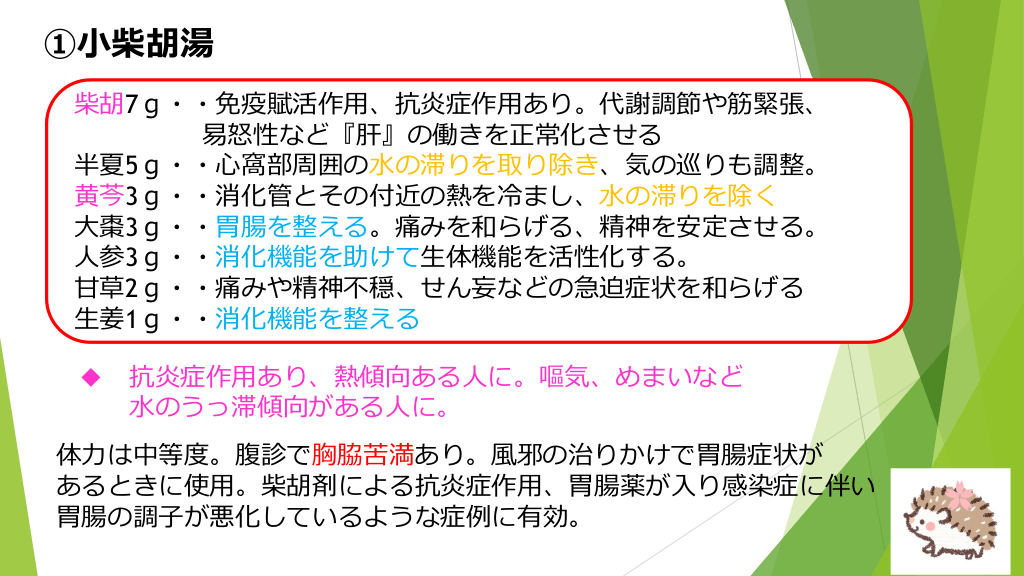 #14. ①小柴胡湯 柴胡7g・・免疫賦活作用、抗炎症作用あり。代謝調節や筋緊張、 易怒性など『肝』の働きを正常化させる 半夏5g・・心窩部周囲の水の滞りを取り除き、気の巡りも調整。 黄芩3g・・消化管とその付近の熱を冷まし、水の滞りを除く 大棗3g・・胃腸を整える。痛みを和らげる、精神を安定させる。 人参3g・・消化機能を助けて生体機能を活性化する。 甘草2g・・痛みや精神不穏、せん妄などの急迫症状を和らげる 生姜1g・・消化機能を整える ◆ 抗炎症作用あり、熱傾向ある人に。嘔気、めまいなど 水のうっ滞傾向がある人に。 体力は中等度。腹診で胸脇苦満あり。風邪の治りかけで胃腸症状が あるときに使用。柴胡剤による抗炎症作用、胃腸薬が入り感染症に伴い 胃腸の調子が悪化しているような症例に有効。
