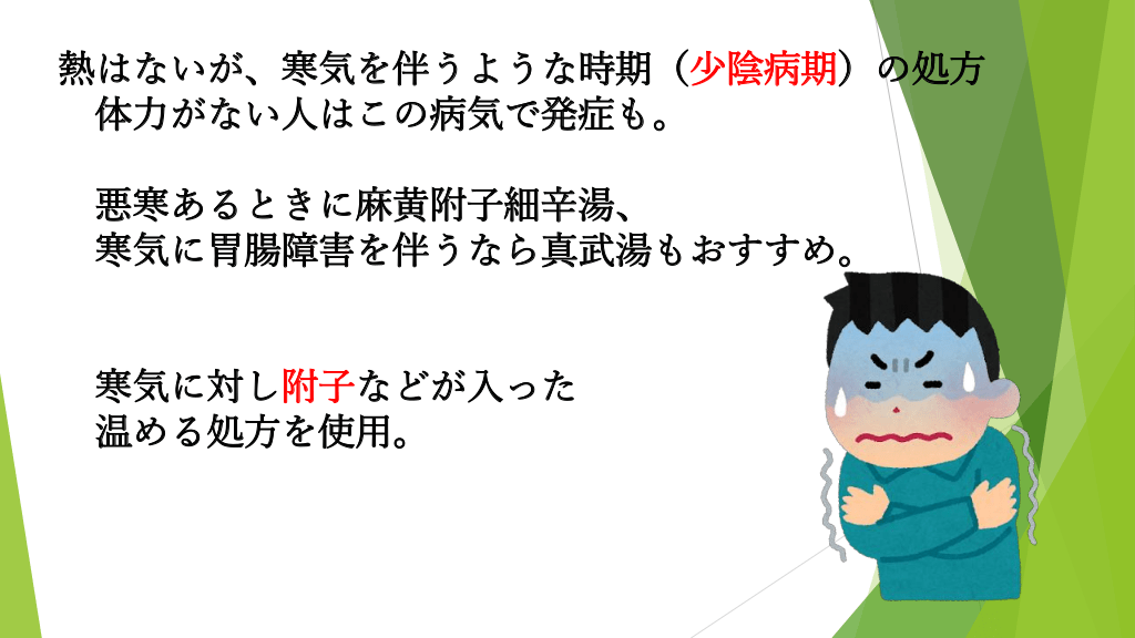 #16. 熱はないが、寒気を伴うような時期(少陰病期)の処方 体力がない人はこの病気で発症も。 悪寒あるときに麻黄附子細辛湯、 寒気に胃腸障害を伴うなら真武湯もおすすめ。 寒気に対し附子などが入った 温める処方を使用。