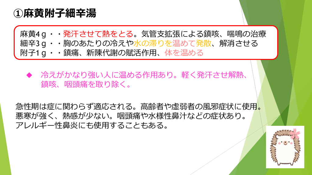#17. ①麻黄附子細辛湯 麻黄4g・・発汗させて熱をとる。気管支拡張による鎮咳、喘鳴の治療 細辛3g・・胸のあたりの冷えや水の滞りを温めて発散、解消させる 附子1g・・鎮痛、新陳代謝の賦活作用、体を温める ◆ 冷えがかなり強い人に温める作用あり。軽く発汗させ解熱、 鎮咳、咽頭痛を取り除く。 急性期は症に関わらず適応される。高齢者や虚弱者の風邪症状に使用。 悪寒が強く、熱感が少ない。咽頭痛や水様性鼻汁などの症状あり。 アレルギー性鼻炎にも使用することもある。