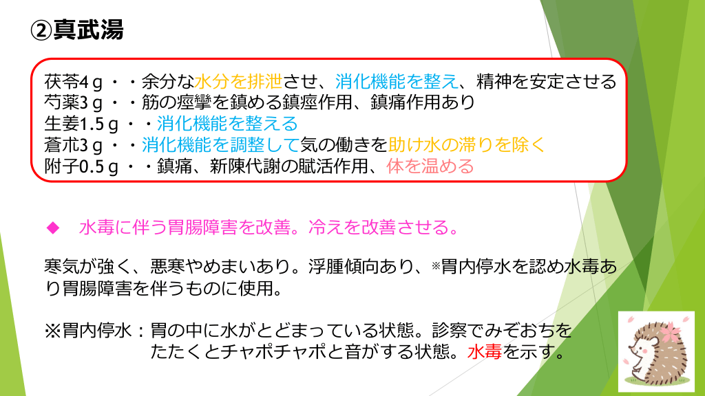 #18. ②真武湯 茯苓4g・・余分な水分を排泄させ、消化機能を整え、精神を安定させる 芍薬3g・・筋の痙攣を鎮める鎮痙作用、鎮痛作用あり 生姜1.5g・・消化機能を整える 蒼朮3g・・消化機能を調整して気の働きを助け水の滞りを除く 附子0.5g・・鎮痛、新陳代謝の賦活作用、体を温める ◆ 水毒に伴う胃腸障害を改善。冷えを改善させる。 寒気が強く、悪寒やめまいあり。浮腫傾向あり、※胃内停水を認め水毒あ り胃腸障害を伴うものに使用。 ※胃内停水:胃の中に水がとどまっている状態。診察でみぞおちを たたくとチャポチャポと音がする状態。水毒を示す。