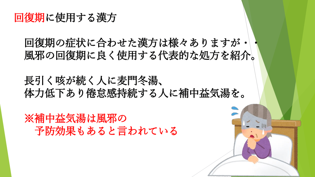 #19. 回復期に使用する漢方 回復期の症状に合わせた漢方は様々ありますが・・ 風邪の回復期に良く使用する代表的な処方を紹介。 長引く咳が続く人に麦門冬湯、 体力低下あり倦怠感持続する人に補中益気湯を。 ※補中益気湯は風邪の 予防効果もあると言われている