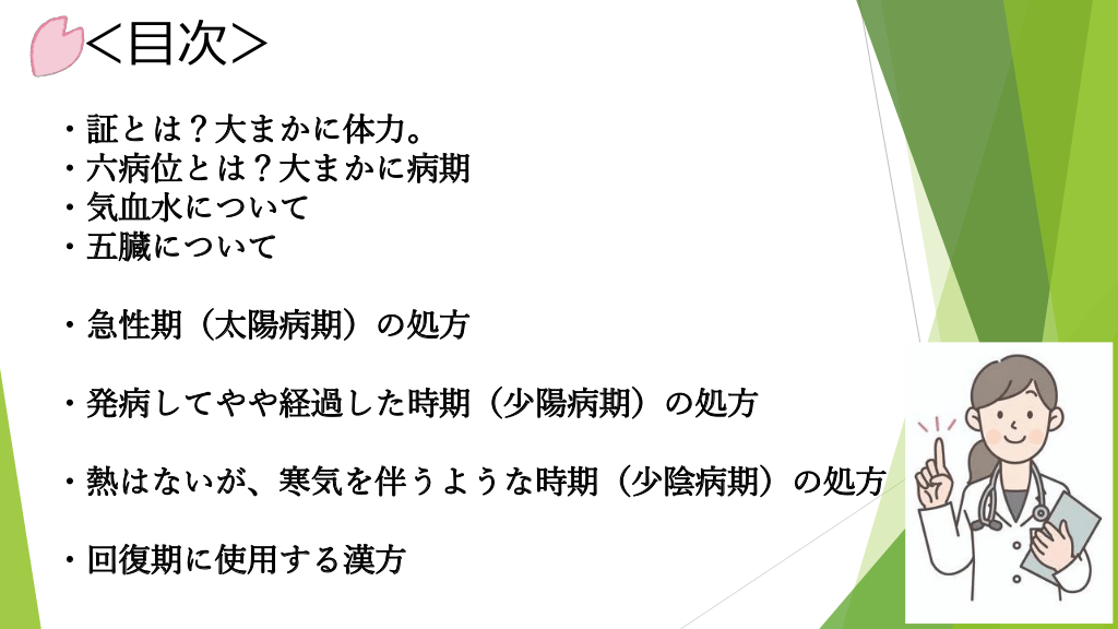 #2. <目次> ・証とは?大まかに体力。 ・六病位とは?大まかに病期 ・気血水について ・五臓について ・急性期(太陽病期)の処方 ・発病してやや経過した時期(少陽病期)の処方 ・熱はないが、寒気を伴うような時期(少陰病期)の処方 ・回復期に使用する漢方