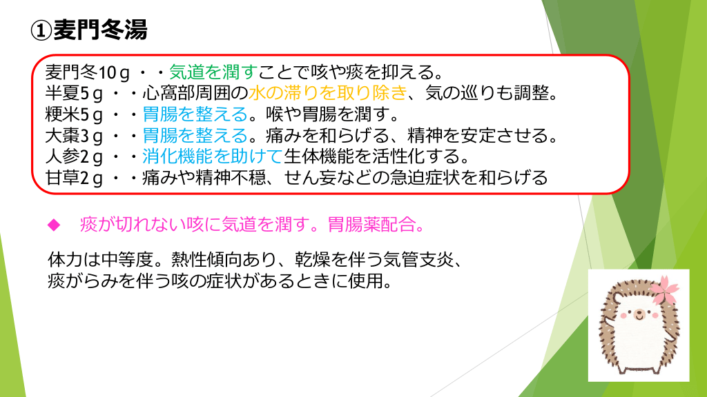 #20. ①麦門冬湯 麦門冬10g・・気道を潤すことで咳や痰を抑える。 半夏5g・・心窩部周囲の水の滞りを取り除き、気の巡りも調整。 粳米5g・・胃腸を整える。喉や胃腸を潤す。 大棗3g・・胃腸を整える。痛みを和らげる、精神を安定させる。 人参2g・・消化機能を助けて生体機能を活性化する。 甘草2g・・痛みや精神不穏、せん妄などの急迫症状を和らげる ◆ 痰が切れない咳に気道を潤す。胃腸薬配合。 体力は中等度。熱性傾向あり、乾燥を伴う気管支炎、 痰がらみを伴う咳の症状があるときに使用。