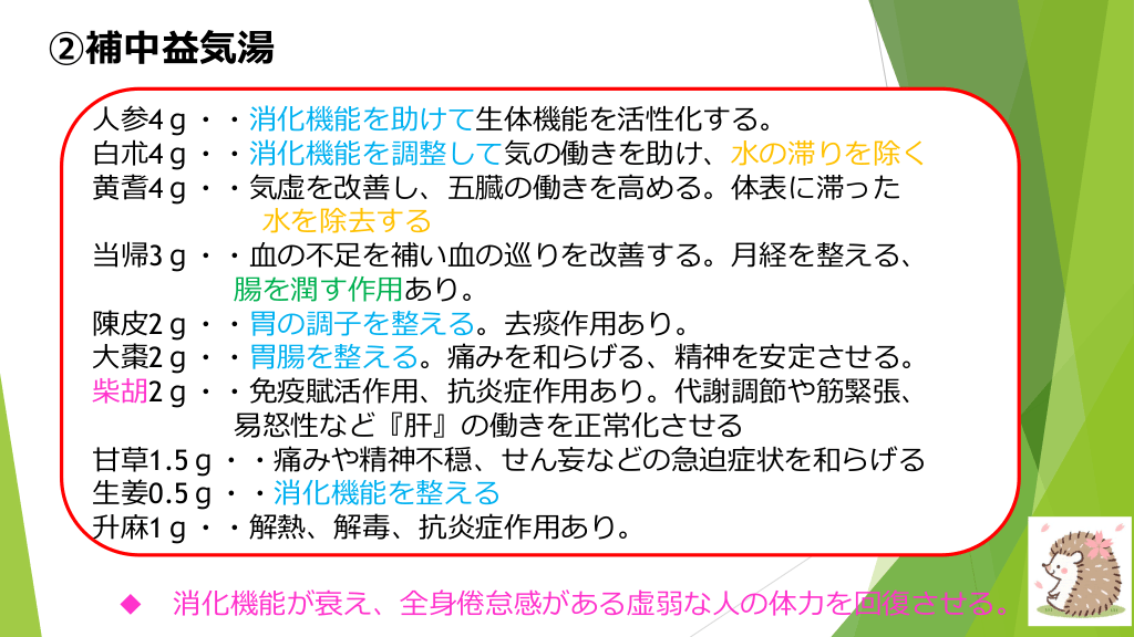 #21. ②補中益気湯 人参4g・・消化機能を助けて生体機能を活性化する。 白朮4g・・消化機能を調整して気の働きを助け、水の滞りを除く 黄耆4g・・気虚を改善し、五臓の働きを高める。体表に滞った 水を除去する 当帰3g・・血の不足を補い血の巡りを改善する。月経を整える、 腸を潤す作用あり。 陳皮2g・・胃の調子を整える。去痰作用あり。 大棗2g・・胃腸を整える。痛みを和らげる、精神を安定させる。 柴胡2g・・免疫賦活作用、抗炎症作用あり。代謝調節や筋緊張、 易怒性など『肝』の働きを正常化させる 甘草1.5g・・痛みや精神不穏、せん妄などの急迫症状を和らげる 生姜0.5g・・消化機能を整える 升麻1g・・解熱、解毒、抗炎症作用あり。 ◆ 消化機能が衰え、全身倦怠感がある虚弱な人の体力を回復させる。