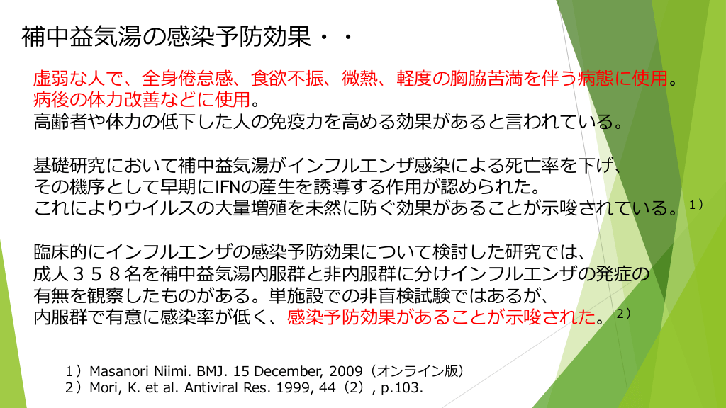 #22. 補中益気湯の感染予防効果・・ 虚弱な人で、全身倦怠感、食欲不振、微熱、軽度の胸脇苦満を伴う病態に使用。 病後の体力改善などに使用。 高齢者や体力の低下した人の免疫力を高める効果があると言われている。 基礎研究において補中益気湯がインフルエンザ感染による死亡率を下げ、 その機序として早期にIFNの産生を誘導する作用が認められた。 これによりウイルスの大量増殖を未然に防ぐ効果があることが示唆されている。1) 臨床的にインフルエンザの感染予防効果について検討した研究では、 成人358名を補中益気湯内服群と非内服群に分けインフルエンザの発症の 有無を観察したものがある。単施設での非盲検試験ではあるが、 内服群で有意に感染率が低く、感染予防効果があることが示唆された。2) 1)Masanori Niimi. BMJ. 15 December, 2009(オンライン版) 2)Mori, K. et al. Antiviral Res. 1999, 44(2), p.103.