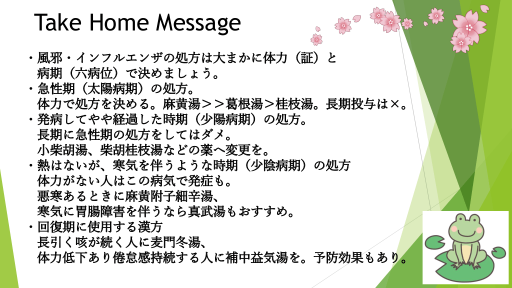#23. Take Home Message ・風邪・インフルエンザの処方は大まかに体力(証)と 病期(六病位)で決めましょう。 ・急性期(太陽病期)の処方。 体力で処方を決める。麻黄湯>>葛根湯>桂枝湯。長期投与は×。 ・発病してやや経過した時期(少陽病期)の処方。 長期に急性期の処方をしてはダメ。 小柴胡湯、柴胡桂枝湯などの薬へ変更を。 ・熱はないが、寒気を伴うような時期(少陰病期)の処方 体力がない人はこの病気で発症も。 悪寒あるときに麻黄附子細辛湯、 寒気に胃腸障害を伴うなら真武湯もおすすめ。 ・回復期に使用する漢方 長引く咳が続く人に麦門冬湯、 体力低下あり倦怠感持続する人に補中益気湯を。予防効果もあり。