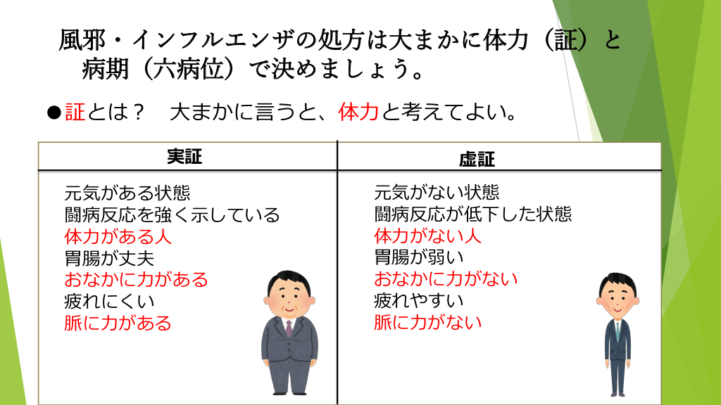 #3. 風邪・インフルエンザの処方は大まかに体力(証)と 病期(六病位)で決めましょう。 ●証とは? 大まかに言うと、体力と考えてよい。 実証 元気がある状態 闘病反応を強く示している 体力がある人 胃腸が丈夫 おなかに力がある 疲れにくい 脈に力がある 虚証 元気がない状態 闘病反応が低下した状態 体力がない人 胃腸が弱い おなかに力がない 疲れやすい 脈に力がない