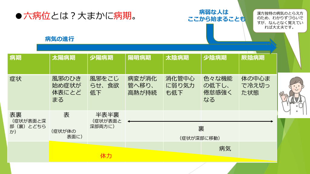 #4. ●六病位とは?大まかに病期。 病弱な人は ここから始まることも 漢方独特の病気のとらえ方 のため、わかりずづらいで すが、なんとなく覚えてい れば大丈夫です。 病気の進行 病期 太陽病期 少陽病期 陽明病期 太陰病期 少陰病期 厥陰病期 症状 風邪のひき 始め症状が 体表にとど まる 風邪をこじ らせ、食欲 低下 病変が消化 管へ移り、 高熱が持続 消化管中心 に弱り気力 も低下 色々な機能 の低下し、 倦怠感強く なる 体の中心ま で冷え切っ た状態 表裏 表 (症状が表面と深 部(裏)とどちら (症状が体の か) 表面に) 半表半裏 (症状が表面と 深部両方に) 裏 (症状が深部に移動) 病気 体力