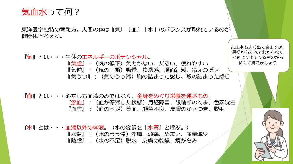 #5. 気血水って何? 東洋医学独特の考え方。人間の体は『気』『血』『水』のバランスが取れているのが 健康体と考える。 『気』とは・・・生体のエネルギーのポテンシャル。 『気虚』:(気の低下)気力がない、だるい、疲れやすい 『気逆』:(気の上衝)動悸、焦燥感、顔面紅潮、冷えのぼせ 『気うつ』:(気のうっ滞)胸の詰まった感じ、喉の詰まった感じ 気血水もよく出てきますが、 最初からすべてわからなく ともよく出てくるものから 徐々に覚えましょう 『血』とは・・・必ずしも血液のみではなく、全身をめぐり栄養を運ぶもの。 『瘀血』:(血が停滞した状態)月経障害、眼輪部のくま、色素沈着 『血虚』:(血の不足)貧血、顔色不良、皮膚のかさつき、脱毛 『水』とは・・・血液以外の体液。(水の変調を『水毒』と呼ぶ。) 『水滞』:(水のうっ滞)浮腫、頭痛、めまい、尿量減少 『陰虚』:(水の不足)脱水、皮膚の乾燥、痰がらみ