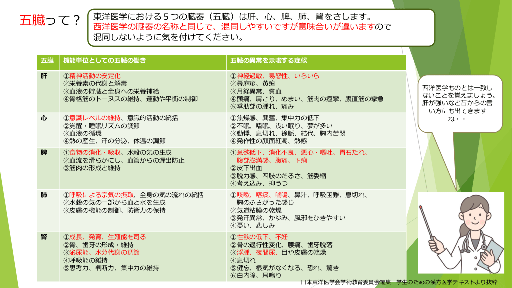 #6. 五臓って? 東洋医学における5つの臓器(五臓)は肝、心、脾、肺、腎をさします。 西洋医学の臓器の名称と同じで、混同しやすいですが意味合いが違いますので 混同しないように気を付けてください。 五臓 機能単位としての五臓の働き 五臓の異常を示唆する症候 肝 ①精神活動の安定化 ②栄養素の代謝と解毒 ③血液の貯蔵と全身への栄養補給 ④骨格筋のトーヌスの維持、運動や平衡の制御 ①神経過敏、易怒性、いらいら ②蕁麻疹、黄疸 ③月経異常、貧血 ④頭痛、肩こり、めまい、筋肉の痙攣、腹直筋の攣急 ⑤季肋部の腫れ、痛み 心 ①意識レベルの維持、意識的活動の統括 ②覚醒・睡眠リズムの調節 ③血液の循環 ④熱の産生、汗の分泌、体温の調節 ①焦燥感、興奮、集中力の低下 ②不眠、嗜眠、浅い眠り、夢が多い ③動悸、息切れ、徐脈、結代、胸内苦悶 ④発作性の顔面紅潮、熱感 脾 ①食物の消化・吸収、水穀の気の生成 ②血流を滑らかにし、血管からの漏出防止 ③筋肉の形成と維持 ①意欲低下、消化不良、悪心・嘔吐、胃もたれ、 腹部膨満感、腹痛、下痢 ②皮下出血 ③脱力感、四肢のだるさ、筋委縮 ④考え込み、抑うつ 肺 ①呼吸による宗気の摂取、全身の気の流れの統括 ②水穀の気の一部から血と水を生成 ③皮膚の機能の制御、防衛力の保持 ①咳嗽、喀痰、喘鳴、鼻汁、呼吸困難、息切れ、 胸のふさがった感じ ②気道粘膜の乾燥 ③発汗異常、かゆみ、風邪をひきやすい ④憂い、悲しみ 腎 ①成長、発育、生殖能を司る ②骨、歯牙の形成・維持 ③泌尿能、水分代謝の調節 ④呼吸能の維持 ⑤思考力、判断力、集中力の維持 ①性欲の低下、不妊 ②骨の退行性変化、腰痛、歯牙脱落 ③浮腫、夜間尿、目や皮膚の乾燥 ④息切れ ⑤健忘、根気がなくなる、恐れ、驚き ⑥白内障、耳鳴り 西洋医学ものとは一致し ないことを覚えましょう。 肝が強いなど昔からの言 い方にも出てきます ね・・ 日本東洋医学会学術教育委員会編集 学生のための漢方医学テキストより抜粋
