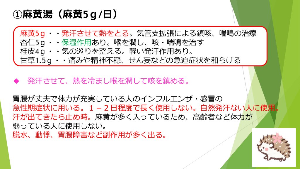 #8. ①麻黄湯(麻黄5g/日) 麻黄5g・・発汗させて熱をとる。気管支拡張による鎮咳、喘鳴の治療 杏仁5g・・保湿作用あり。喉を潤し、咳・喘鳴を治す 桂皮4g・・気の巡りを整える。軽い発汗作用あり。 甘草1.5g・・痛みや精神不穏、せん妄などの急迫症状を和らげる ◆ 発汗させて、熱を冷まし喉を潤して咳を鎮める。 胃腸が丈夫で体力が充実している人のインフルエンザ・感冒の 急性期症状に用いる。1-2日程度で長く使用しない。自然発汗ない人に使用。 汗が出てきたら止め時。麻黄が多く入っているため、高齢者など体力が 弱っている人に使用しない。 脱水、動悸、胃腸障害など副作用が多く出る。