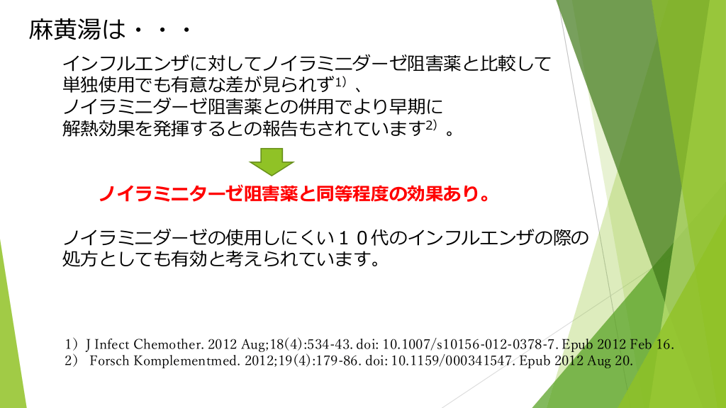#9. 麻黄湯は・・・ インフルエンザに対してノイラミニダーゼ阻害薬と比較して 単独使用でも有意な差が見られず1)、 ノイラミニダーゼ阻害薬との併用でより早期に 解熱効果を発揮するとの報告もされています2)。 ノイラミニターゼ阻害薬と同等程度の効果あり。 ノイラミニダーゼの使用しにくい10代のインフルエンザの際の 処方としても有効と考えられています。 1)J Infect Chemother. 2012 Aug;18(4):534-43. doi: 10.1007/s10156-012-0378-7. Epub 2012 Feb 16. 2) Forsch Komplementmed. 2012;19(4):179-86. doi: 10.1159/000341547. Epub 2012 Aug 20.