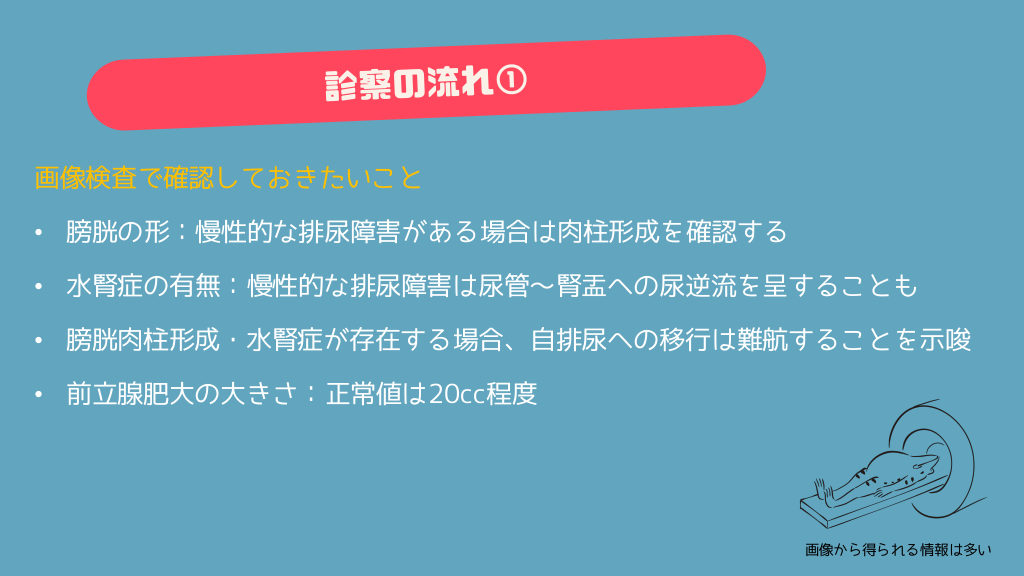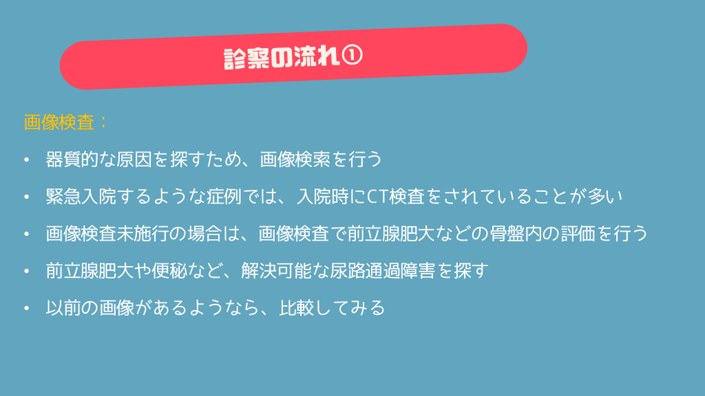 #10. 画像検査: • 器質的な原因を探すため、画像検索を行う • 緊急入院するような症例では、入院時にCT検査をされていることが多い • 画像検査未施行の場合は、画像検査で前立腺肥大などの骨盤内の評価を行う • 前立腺肥大や便秘など、解決可能な尿路通過障害を探す • 以前の画像があるようなら、比較してみる