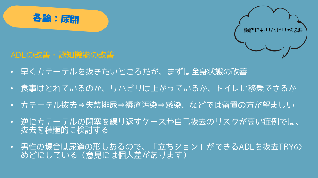 #14. 膀胱にもリハビリが必要 ADLの改善・認知機能の改善 • 早くカテーテルを抜きたいところだが、まずは全身状態の改善 • 食事はとれているのか、リハビリは上がっているか、トイレに移乗できるか • カテーテル抜去⇒失禁排尿⇒褥瘡汚染⇒感染、などでは留置の方が望ましい • 逆にカテーテルの閉塞を繰り返すケースや自己抜去のリスクが高い症例では、 抜去を積極的に検討する • 男性の場合は尿道の形もあるので、「立ちション」ができるADLを抜去TRYの めどにしている(意見には個人差があります)