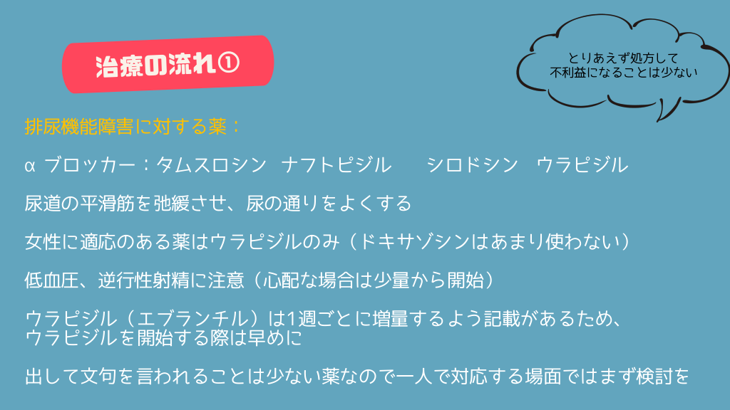 #17. とりあえず処方して 不利益になることは少ない 排尿機能障害に対する薬: αブロッカー:タムスロシン ナフトピジル シロドシン ウラピジル 尿道の平滑筋を弛緩させ、尿の通りをよくする 女性に適応のある薬はウラピジルのみ(ドキサゾシンはあまり使わない) 低血圧、逆行性射精に注意(心配な場合は少量から開始) ウラピジル(エブランチル)は1週ごとに増量するよう記載があるため、 ウラピジルを開始する際は早めに 出して文句を言われることは少ない薬なので一人で対応する場面ではまず検討を