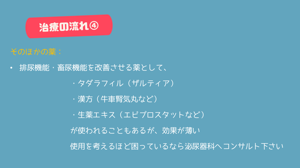 #20. そのほかの薬: • 排尿機能・畜尿機能を改善させる薬として、 ・タダラフィル(ザルティア) ・漢方(牛車腎気丸など) ・生薬エキス(エビプロスタットなど) が使われることもあるが、効果が薄い 使用を考えるほど困っているなら泌尿器科へコンサルト下さい