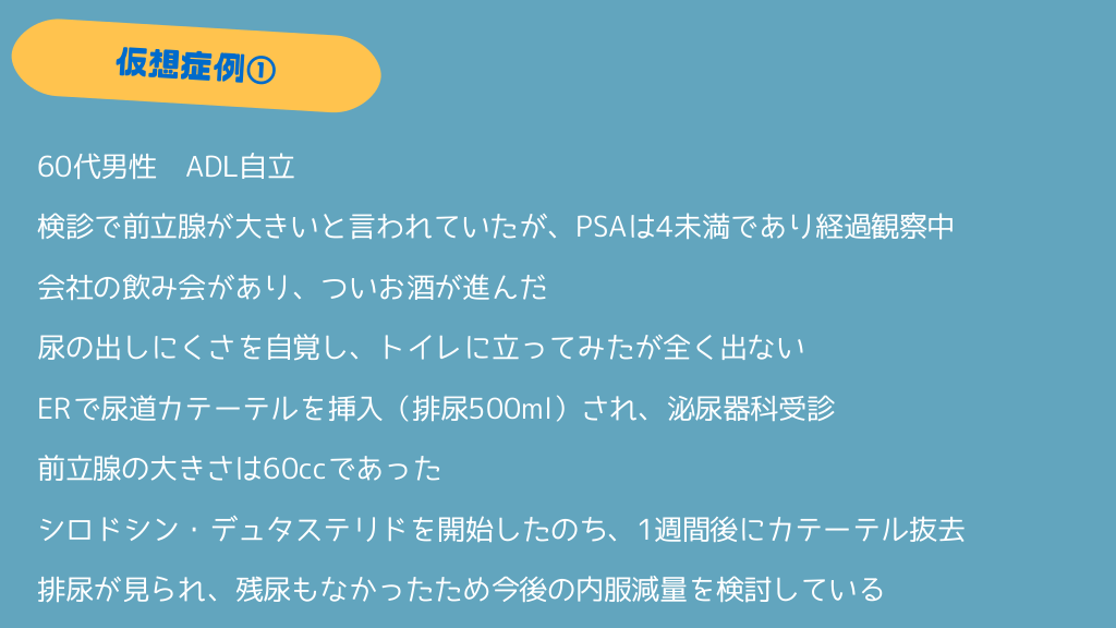 #21. 60代男性 ADL自立 検診で前立腺が大きいと言われていたが、PSAは4未満であり経過観察中 会社の飲み会があり、ついお酒が進んだ 尿の出しにくさを自覚し、トイレに立ってみたが全く出ない ERで尿道カテーテルを挿入(排尿500ml)され、泌尿器科受診 前立腺の大きさは60ccであった シロドシン・デュタステリドを開始したのち、1週間後にカテーテル抜去 排尿が見られ、残尿もなかったため今後の内服減量を検討している