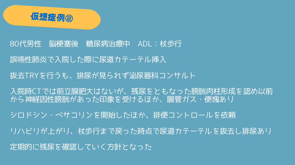 #22. 80代男性 脳梗塞後 糖尿病治療中 ADL:杖歩行 誤嚥性肺炎で入院した際に尿道カテーテル挿入 抜去TRYを行うも、排尿が見られず泌尿器科コンサルト 入院時CTでは前立腺肥大はないが、残尿をともなった膀胱肉柱形成を認め以前 から神経因性膀胱があった印象を受けるほか、腸管ガス・便塊あり シロドシン・ベサコリンを開始したほか、排便コントロールを依頼 リハビリが上がり、杖歩行まで戻った時点で尿道カテーテルを抜去し排尿あり 定期的に残尿を確認していく方針となった