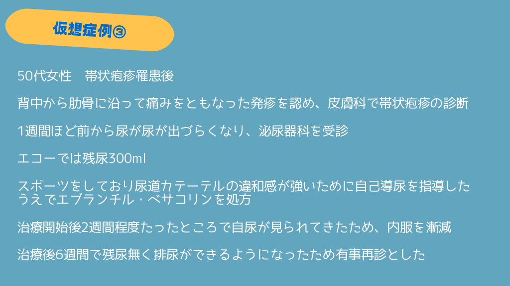 #23. 50代女性 帯状疱疹罹患後 背中から肋骨に沿って痛みをともなった発疹を認め、皮膚科で帯状疱疹の診断 1週間ほど前から尿が尿が出づらくなり、泌尿器科を受診 エコーでは残尿300ml スポーツをしており尿道カテーテルの違和感が強いために自己導尿を指導した うえでエブランチル・ベサコリンを処方 治療開始後2週間程度たったところで自尿が見られてきたため、内服を漸減 治療後6週間で残尿無く排尿ができるようになったため有事再診とした