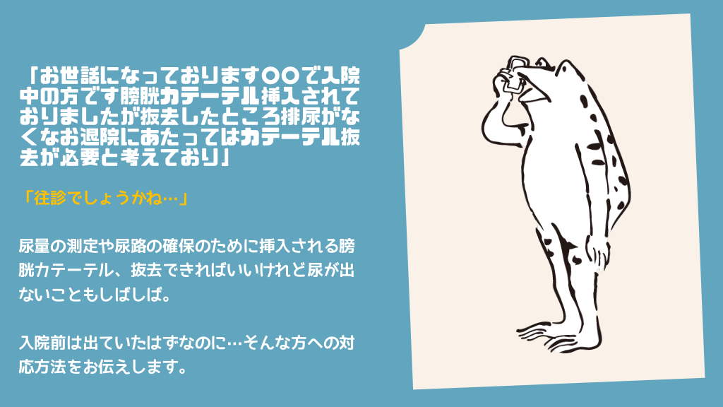 #3. 「お世話になっております○○で入院 中の方です膀胱カテーテル挿入されて おりましたが抜去したところ排尿がな くなお退院にあたってはカテーテル抜 去が必要と考えており」 「往診でしょうかね…」 尿量の測定や尿路の確保のために挿入される膀 胱カテーテル、抜去できればいいけれど尿が出 ないこともしばしば。 入院前は出ていたはずなのに…そんな方への対 応方法をお伝えします。