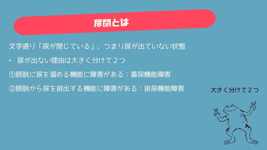 #4. 文字通り「尿が閉じている」、つまり尿が出ていない状態 • 尿が出ない理由は大きく分けて2つ ①膀胱に尿を溜める機能に障害がある:蓄尿機能障害 ②膀胱から尿を排出する機能に障害がある:排尿機能障害 大きく分けて2つ