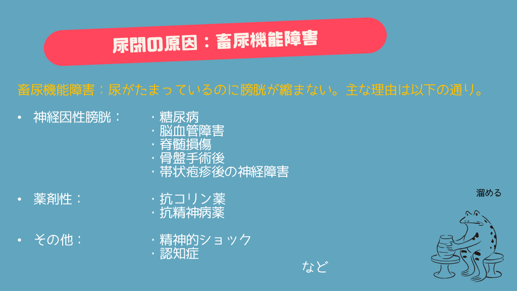#5. 畜尿機能障害:尿がたまっているのに膀胱が縮まない。主な理由は以下の通り。 • 神経因性膀胱: ・糖尿病 ・脳血管障害 ・脊髄損傷 ・骨盤手術後 ・帯状疱疹後の神経障害 • 薬剤性: ・抗コリン薬 ・抗精神病薬 • その他: ・精神的ショック ・認知症 溜める など