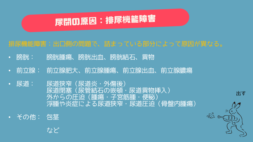 #6. 排尿機能障害:出口側の問題で、詰まっている部分によって原因が異なる。 • 膀胱: 膀胱腫瘍、膀胱出血、膀胱結石、異物 • 前立腺: 前立腺肥大、前立腺腫瘍、前立腺出血、前立腺膿瘍 • 尿道: 尿道狭窄(尿道炎・外傷後) 尿道閉塞(尿管結石の嵌頓・尿道異物挿入) 外からの圧迫(腫瘍・子宮筋腫・便秘) 浮腫や炎症による尿道狭窄・尿道圧迫(骨盤内腫瘍) • その他: 包茎 など 出す