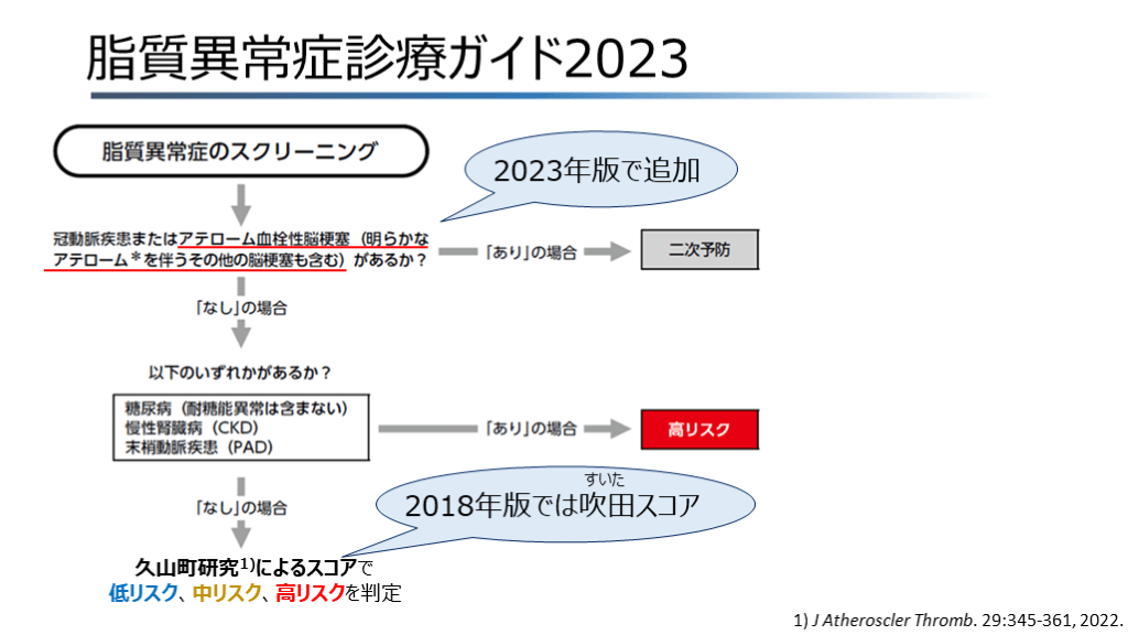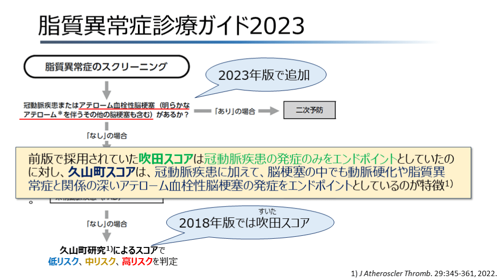 低リスク、中リスク、高リスクを判定 2023年版で追加 2018年版では吹田スコア すいた 1) J Atheroscler Thromb. 29:345-361, 2022. 前版で採用されていた吹田スコアは冠動脈疾患の発症のみをエンドポイントとしていたのに対し、久山町スコアは、冠動脈疾患に加えて、脳梗塞の中でも動脈硬化や脂質異常症と関係の深いアテローム血栓性脳梗塞の発症をエンドポイントとしているのが特徴1)。