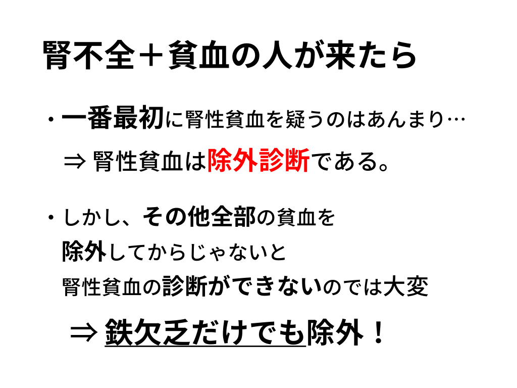 #10. 腎不全+貧血の人が来たら ・一番最初に腎性貧血を疑うのはあんまり…  ⇒ 腎性貧血は除外診断である。 ・しかし、その他全部の貧血を  除外してからじゃないと 腎性貧血の診断ができないのでは大変  ⇒ 鉄欠乏だけでも除外!