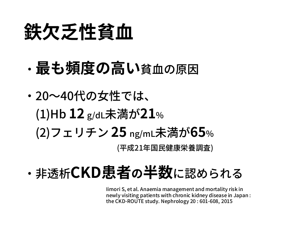 #11. 鉄欠乏性貧血 ・最も頻度の高い貧血の原因 ・20〜40代の女性では、 (1)Hb 12 g/dL未満が21% (2)フェリチン 25 ng/mL未満が65% (平成21年国民健康栄養調査)  ・非透析CKD患者の半数に認められる Iimori S, et al. Anaemia management and mortality risk in newly visiting patients with chronic kidney disease in Japan : the CKD-ROUTE study. Nephrology 20 : 601-608, 2015