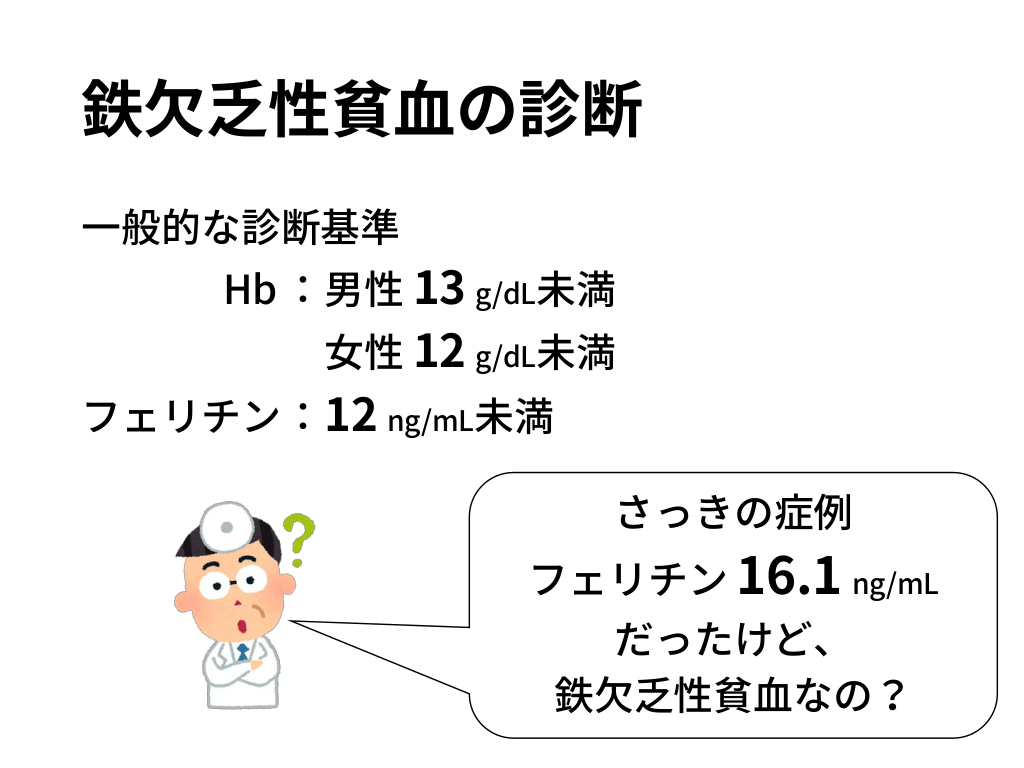 #12. 鉄欠乏性貧血の診断 一般的な診断基準 Hb :男性 13 g/dL未満 女性 12 g/dL未満  フェリチン :12 ng/mL未満 さっきの症例  フェリチン 16.1 ng/mL だったけど、 鉄欠乏性貧血なの?
