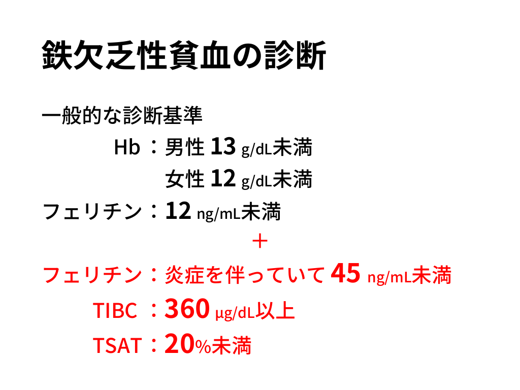 #13. 鉄欠乏性貧血の診断 一般的な診断基準 Hb :男性 13 g/dL未満 女性 12 g/dL未満  フェリチン :12 ng/mL未満 + フェリチン :炎症を伴っていて 45 ng/mL未満 TIBC :360 µg/dL以上 TSAT :20%未満