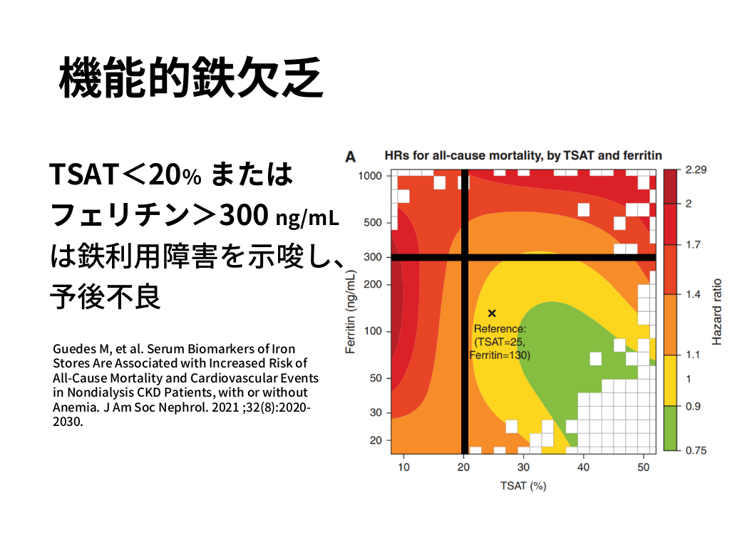 #14. 機能的鉄欠乏 TSAT<20% または フェリチン>300 ng/mL は鉄利用障害を示唆し、 予後不良 Guedes M, et al. Serum Biomarkers of Iron Stores Are Associated with Increased Risk of All-Cause Mortality and Cardiovascular Events in Nondialysis CKD Patients, with or without Anemia. J Am Soc Nephrol. 2021 ;32(8):20202030.