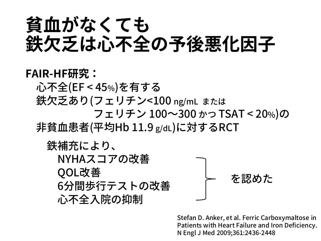 #16. 貧血がなくても 鉄欠乏は心不全の予後悪化因子 FAIR-HF研究: 心不全(EF < 45%)を有する 鉄欠乏あり(フェリチン<100 ng/mL または フェリチン 100~300 かつ TSAT < 20%)の 非貧血患者(平均Hb 11.9 g/dL)に対するRCT 鉄補充により、 NYHAスコアの改善 QOL改善 6分間歩行テストの改善 心不全入院の抑制  を認めた  Stefan D. Anker, et al. Ferric Carboxymaltose in Patients with Heart Failure and Iron Deficiency. N Engl J Med 2009;361:2436-2448