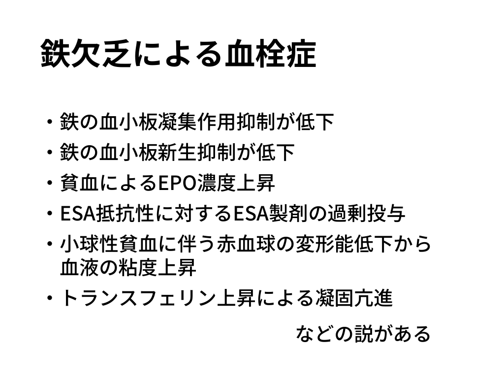 #18. 鉄欠乏による血栓症 ・鉄の血小板凝集作用抑制が低下 ・鉄の血小板新生抑制が低下 ・貧血によるEPO濃度上昇 ・ESA抵抗性に対するESA製剤の過剰投与  ・小球性貧血に伴う赤血球の変形能低下から 血液の粘度上昇 ・トランスフェリン上昇による凝固亢進 などの説がある