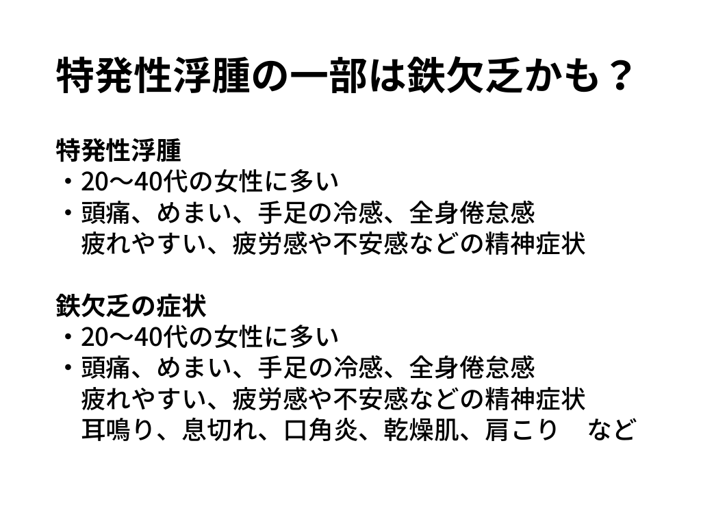 #19. 特発性浮腫の一部は鉄欠乏かも? 特発性浮腫 ・20~40代の女性に多い ・頭痛、めまい、手足の冷感、全身倦怠感 疲れやすい、疲労感や不安感などの精神症状 鉄欠乏の症状 ・20~40代の女性に多い ・頭痛、めまい、手足の冷感、全身倦怠感 疲れやすい、疲労感や不安感などの精神症状 耳鳴り、息切れ、口角炎、乾燥肌、肩こり など