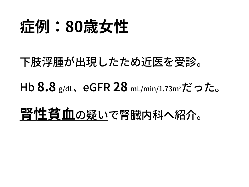 #2. 症例:80歳女性 下肢浮腫が出現したため近医を受診。 Hb 8.8 g/dL、eGFR 28 mL/min/1.73m2だった。  腎性貧血の疑いで腎臓内科へ紹介。