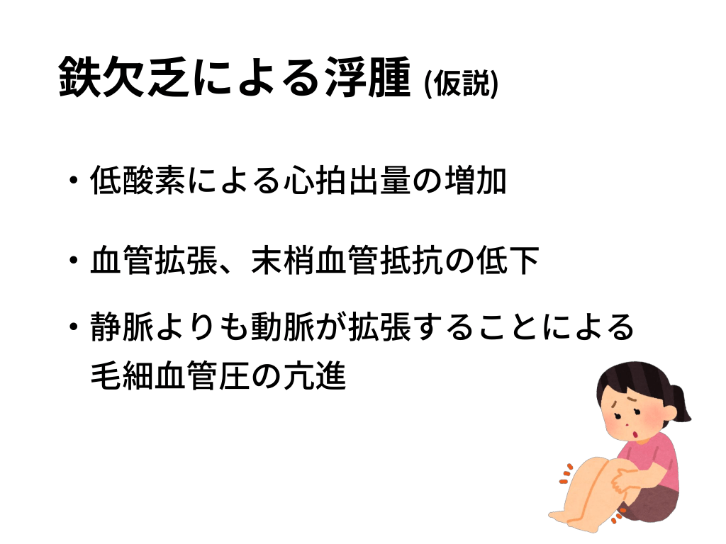 #20. 鉄欠乏による浮腫 (仮説) ・低酸素による心拍出量の増加 ・血管拡張、末梢血管抵抗の低下  ・静脈よりも動脈が拡張することによる 毛細血管圧の亢進