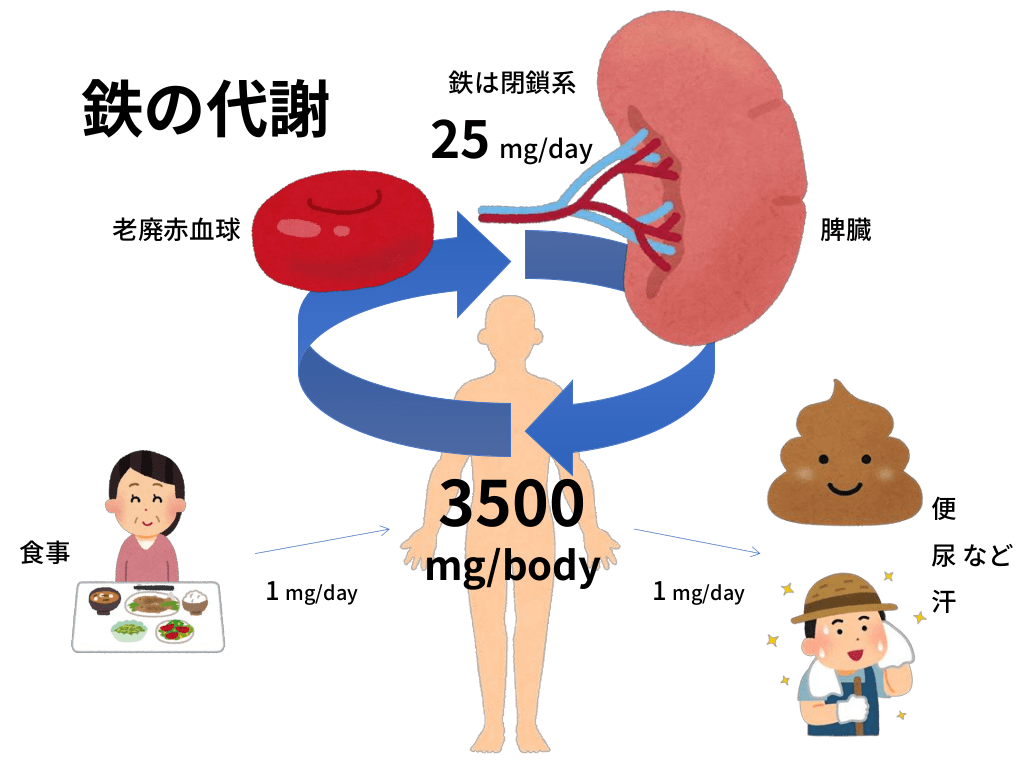 #21. 鉄の代謝  鉄は閉鎖系  25 mg/day  老廃赤血球  脾臓  3500  食事 1 mg/day  mg/body  便  尿 など 1 mg/day  汗