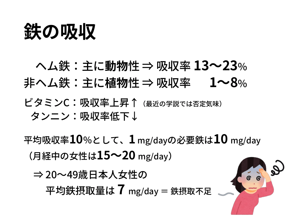 #22. 鉄の吸収 ヘム鉄:主に動物性 ⇒ 吸収率 13~23% 非ヘム鉄:主に植物性 ⇒ 吸収率 1~8% ビタミンC:吸収率上昇↑(最近の学説では否定気味) タンニン:吸収率低下↓ 平均吸収率10%として、1 mg/dayの必要鉄は10 mg/day (月経中の女性は15~20 mg/day)  ⇒ 20~49歳日本人女性の  平均鉄摂取量は 7 mg/day = 鉄摂取不足
