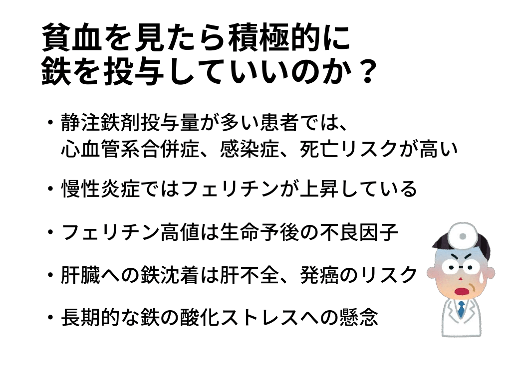 #23. 貧血を見たら積極的に 鉄を投与していいのか? ・静注鉄剤投与量が多い患者では、 心血管系合併症、感染症、死亡リスクが高い  ・慢性炎症ではフェリチンが上昇している ・フェリチン高値は生命予後の不良因子 ・肝臓への鉄沈着は肝不全、発癌のリスク ・長期的な鉄の酸化ストレスへの懸念