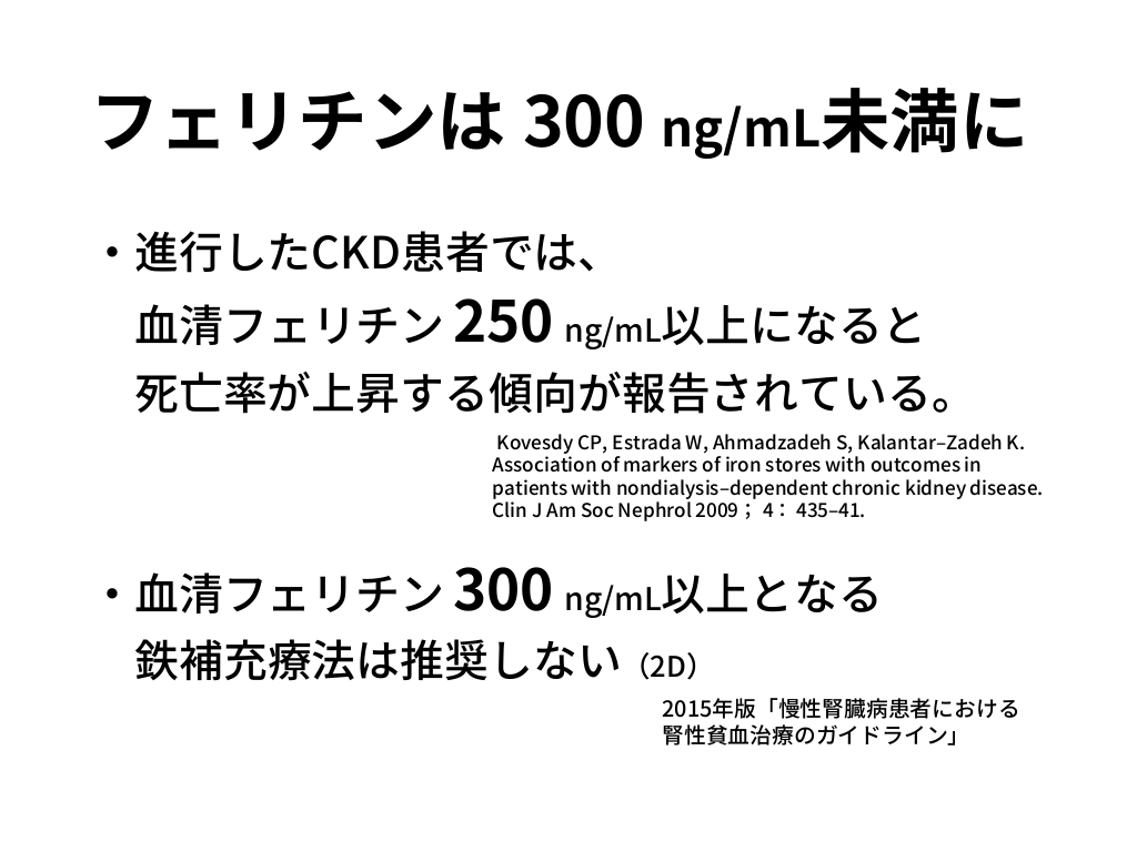 #24. フェリチンは 300 ng/mL未満に ・進行したCKD患者では、 血清フェリチン 250 ng/mL以上になると 死亡率が上昇する傾向が報告されている。 Kovesdy CP, Estrada W, Ahmadzadeh S, Kalantar‒Zadeh K. Association of markers of iron stores with outcomes in patients with nondialysis‒dependent chronic kidney disease. Clin J Am Soc Nephrol 2009; 4: 435‒41.  ・血清フェリチン 300 ng/mL以上となる 鉄補充療法は推奨しない(2D) 2015年版「慢性腎臓病患者における 腎性貧血治療のガイドライン」