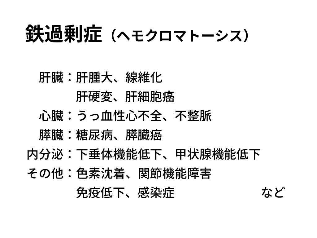 #25. 鉄過剰症(ヘモクロマトーシス) 肝臓:肝腫大、線維化  肝硬変、肝細胞癌 心臓:うっ血性心不全、不整脈 膵臓:糖尿病、膵臓癌 内分泌:下垂体機能低下、甲状腺機能低下 その他:色素沈着、関節機能障害  免疫低下、感染症  など