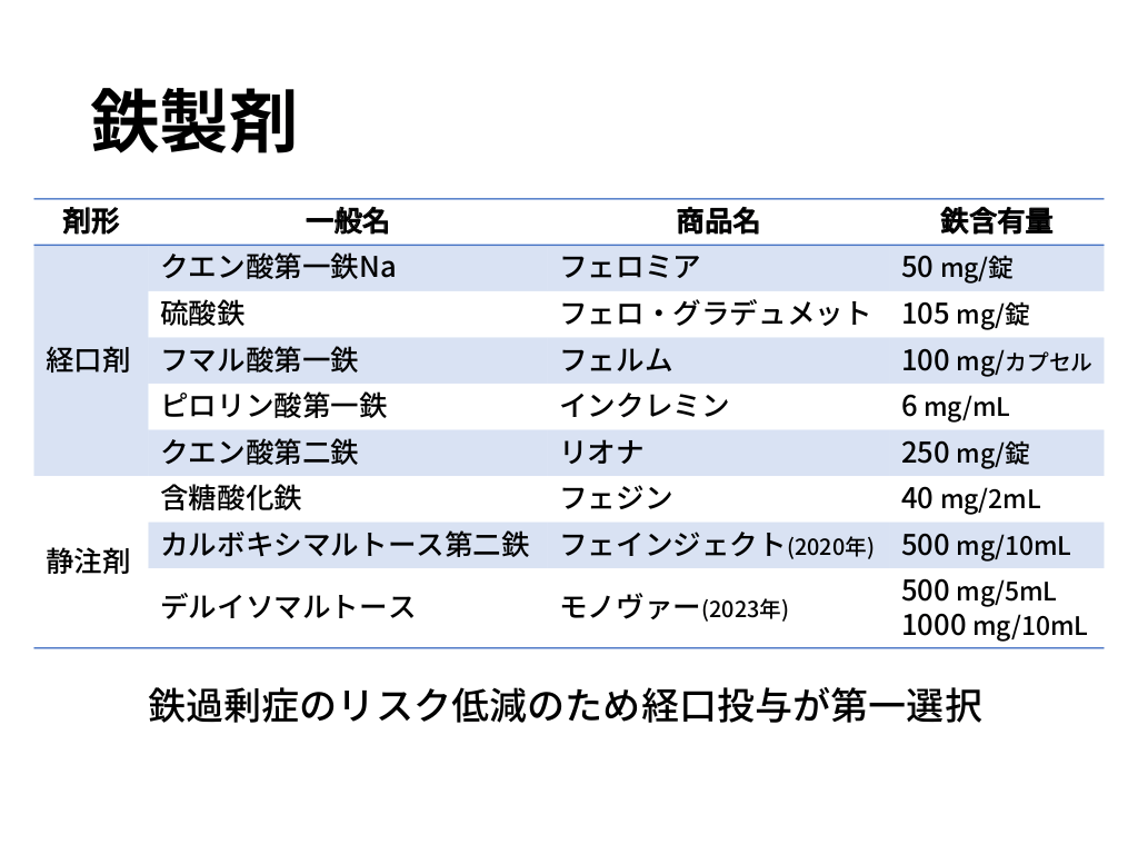#27. 鉄製剤 剤形  経口剤  静注剤  一般名  商品名  鉄含有量  クエン酸第一鉄Na  フェロミア  50 mg/錠  硫酸鉄  フェロ・グラデュメット  105 mg/錠  フマル酸第一鉄  フェルム  100 mg/カプセル  ピロリン酸第一鉄  インクレミン  6 mg/mL  クエン酸第二鉄  リオナ  250 mg/錠  含糖酸化鉄  フェジン  40 mg/2mL  カルボキシマルトース第二鉄  フェインジェクト(2020年) 500 mg/10mL  デルイソマルトース  モノヴァー(2023年)  500 mg/5mL 1000 mg/10mL  鉄過剰症のリスク低減のため経口投与が第一選択