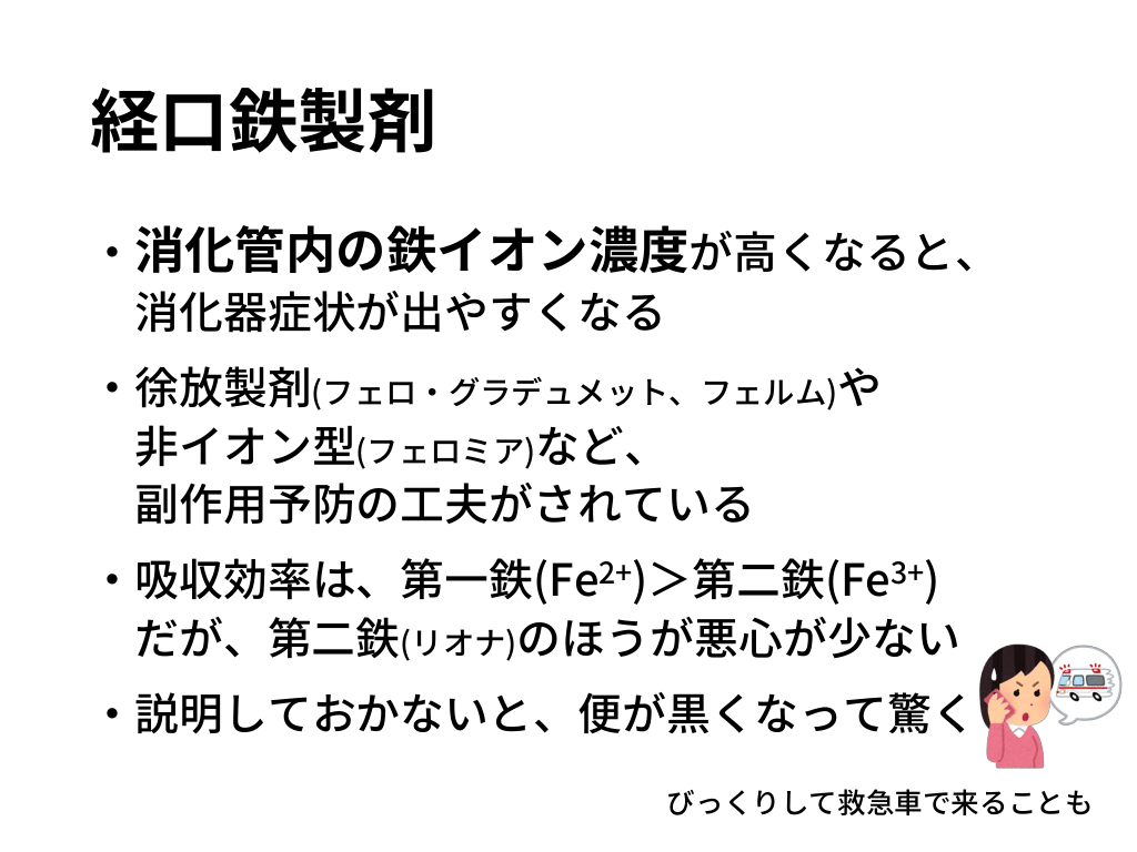#28. 経口鉄製剤 ・消化管内の鉄イオン濃度が高くなると、 消化器症状が出やすくなる ・徐放製剤(フェロ・グラデュメット、フェルム)や 非イオン型(フェロミア)など、 副作用予防の工夫がされている ・吸収効率は、第一鉄(Fe2+)>第二鉄(Fe3+) だが、第二鉄(リオナ)のほうが悪心が少ない  ・説明しておかないと、便が黒くなって驚く びっくりして救急車で来ることも