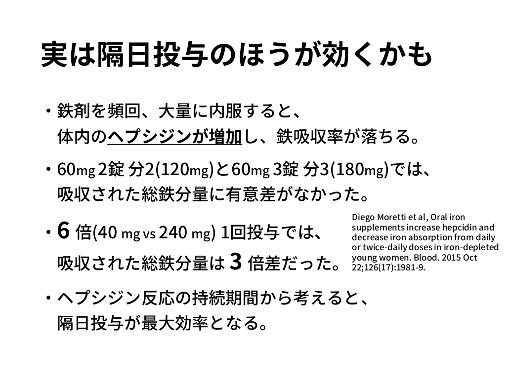 #29. 実は隔日投与のほうが効くかも ・鉄剤を頻回、大量に内服すると、 体内のヘプシジンが増加し、鉄吸収率が落ちる。 ・60mg 2錠 分2(120mg)と60mg 3錠 分3(180mg)では、 吸収された総鉄分量に有意差がなかった。 ・6 倍(40 mg vs 240 mg) 1回投与では、 吸収された総鉄分量は 3 倍差だった。  Diego Moretti et al, Oral iron supplements increase hepcidin and decrease iron absorption from daily or twice-daily doses in iron-depleted young women. Blood. 2015 Oct 22;126(17):1981-9.  ・ヘプシジン反応の持続期間から考えると、 隔日投与が最大効率となる。