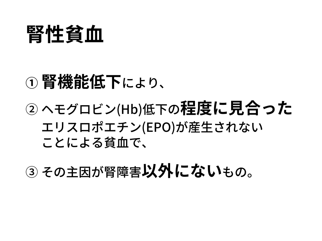 #3. 腎性貧血 ① 腎機能低下により、 ② ヘモグロビン(Hb)低下の程度に見合った エリスロポエチン(EPO)が産生されない ことによる貧血で、 ③ その主因が腎障害以外にないもの。