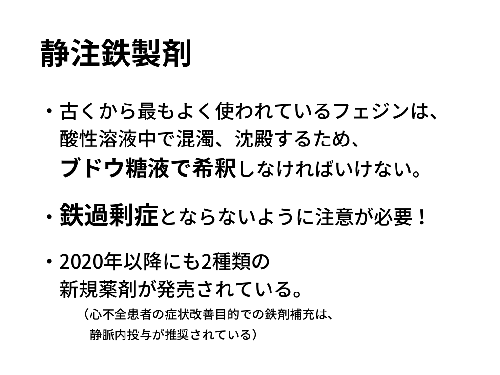 #31. 静注鉄製剤 ・古くから最もよく使われているフェジンは、 酸性溶液中で混濁、沈殿するため、  ブドウ糖液で希釈しなければいけない。 ・鉄過剰症とならないように注意が必要! ・2020年以降にも2種類の 新規薬剤が発売されている。 (心不全患者の症状改善目的での鉄剤補充は、 静脈内投与が推奨されている)